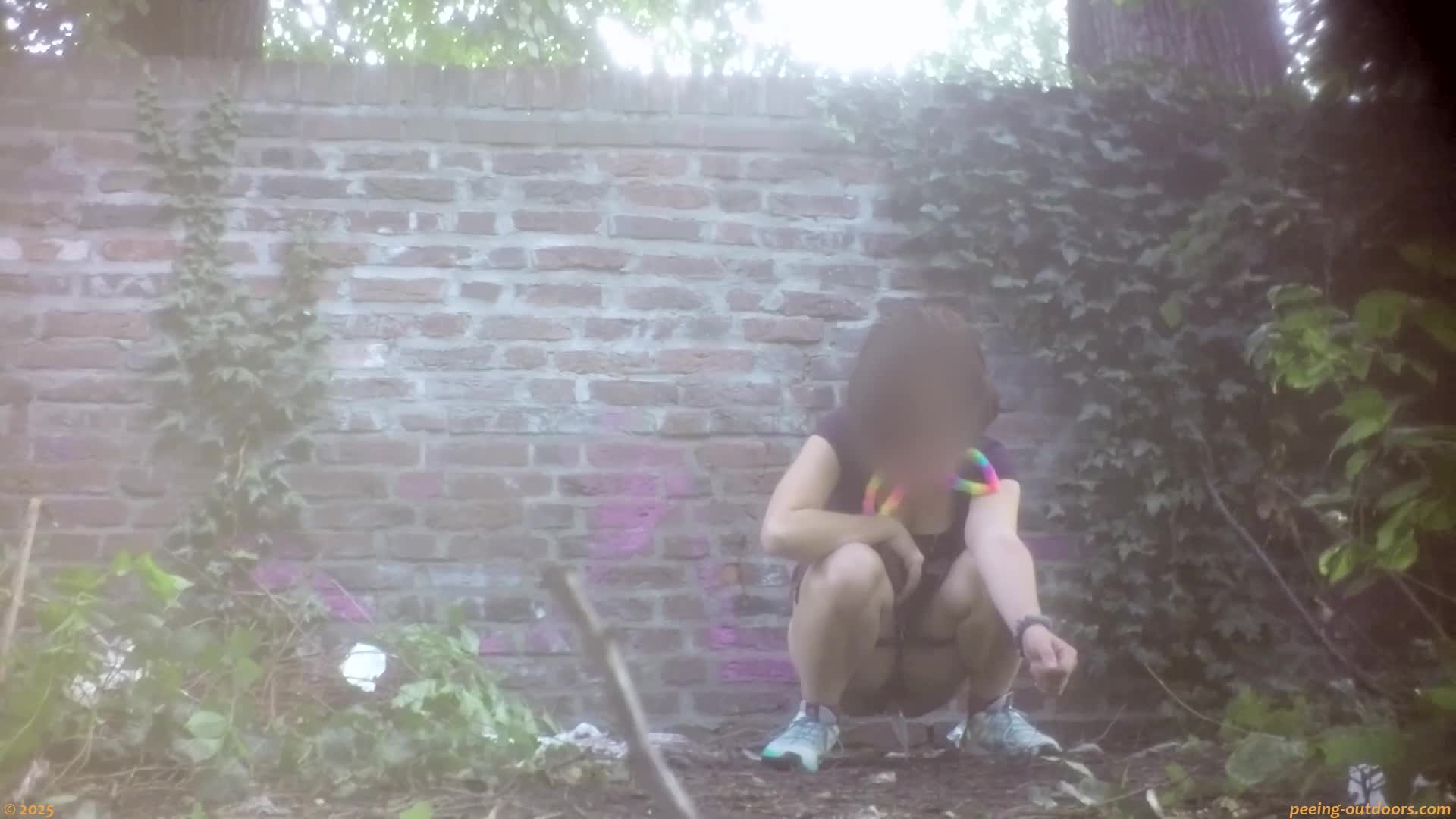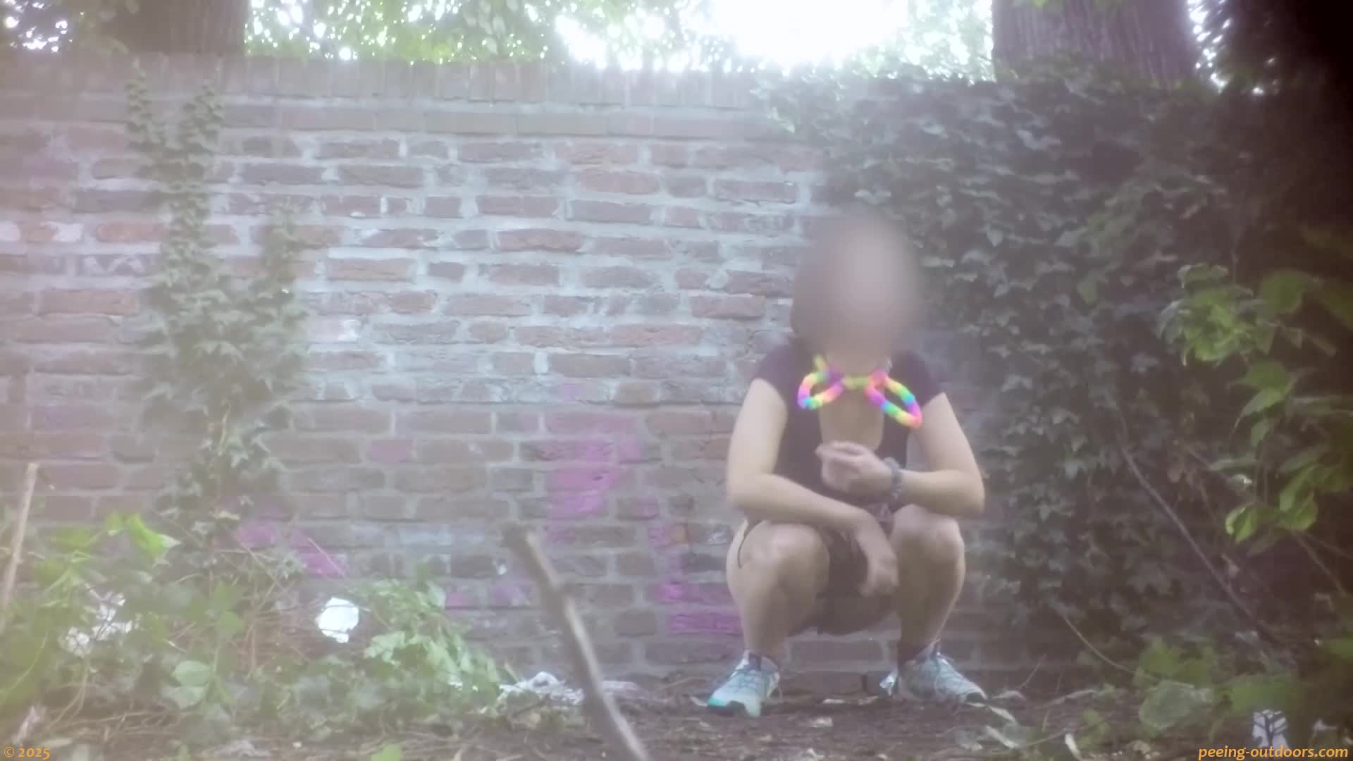 - Slender girl crouches next to a brick wall and pees a visible stream in frontal view.