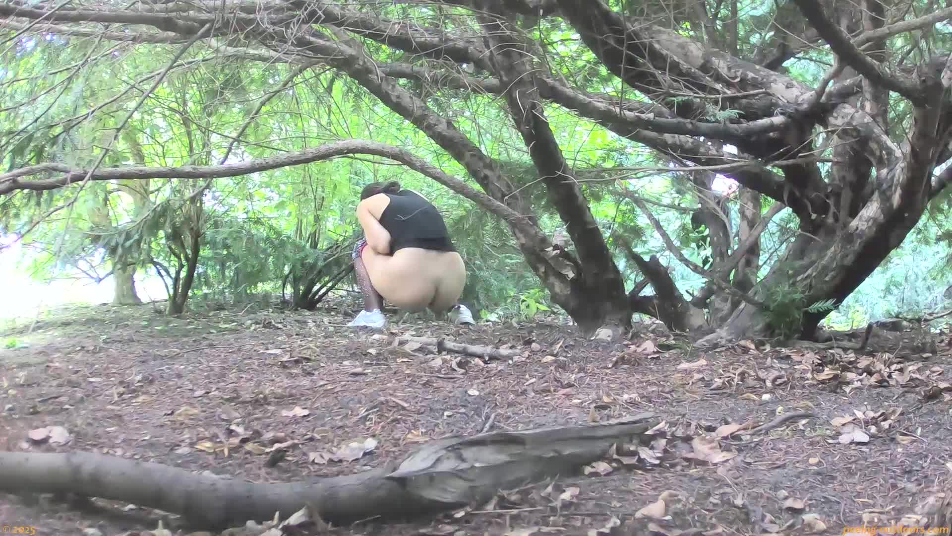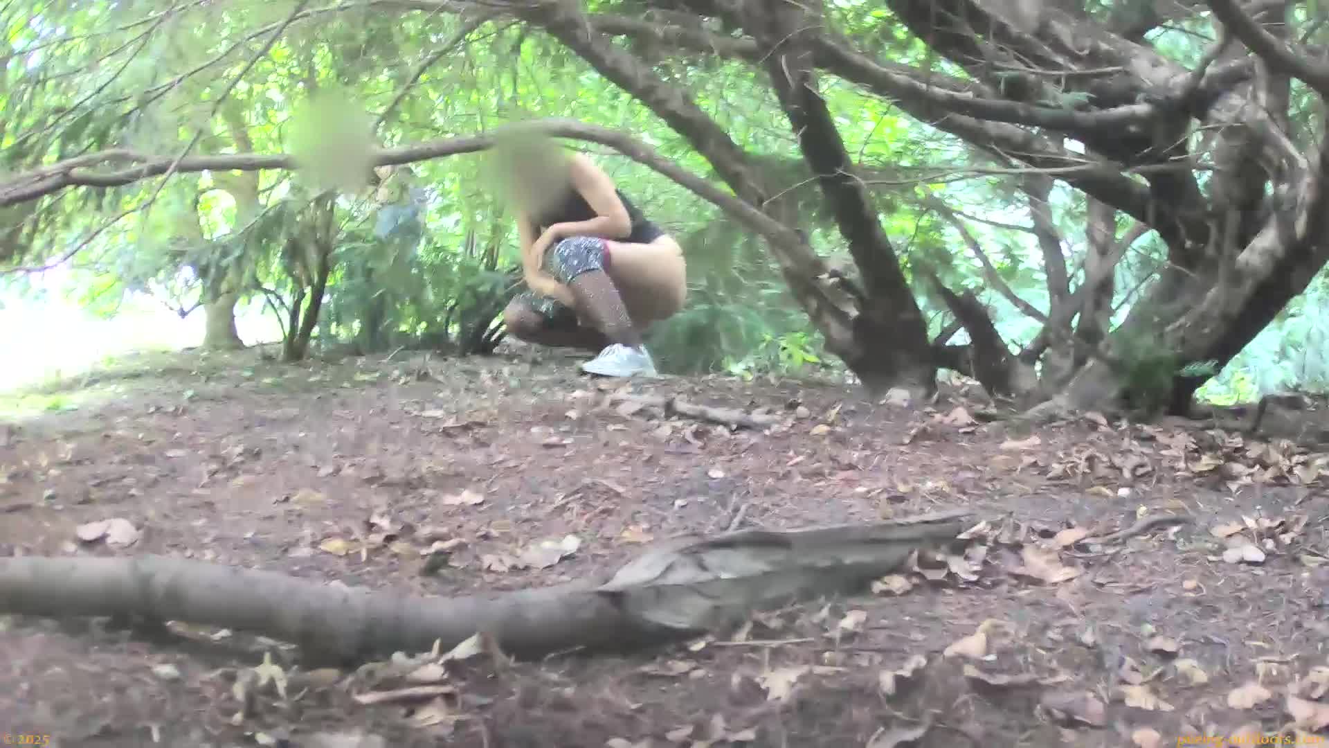 - Girl empties her bladder in a half squat and is filmed from the rear.