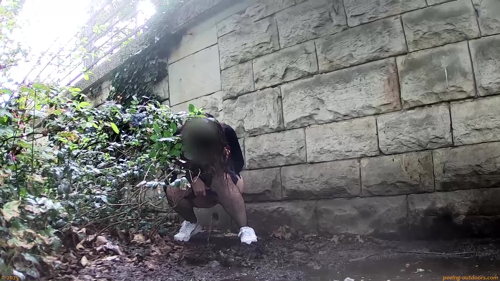 - Young lady squats in front of a wall to empty her bladder openly with stream and pussy shown.