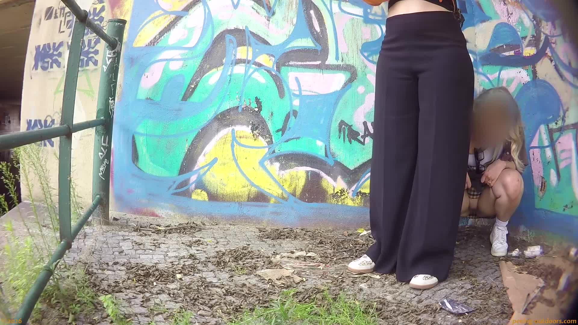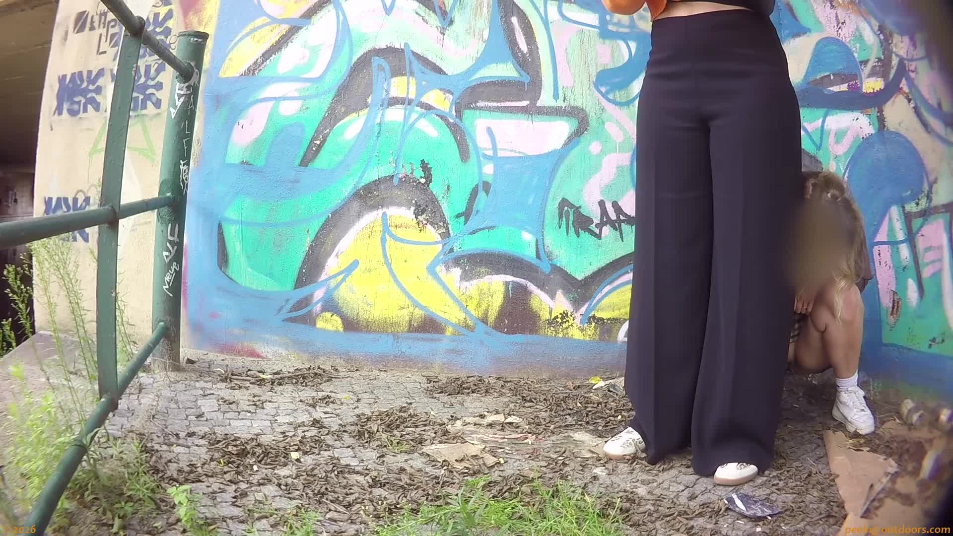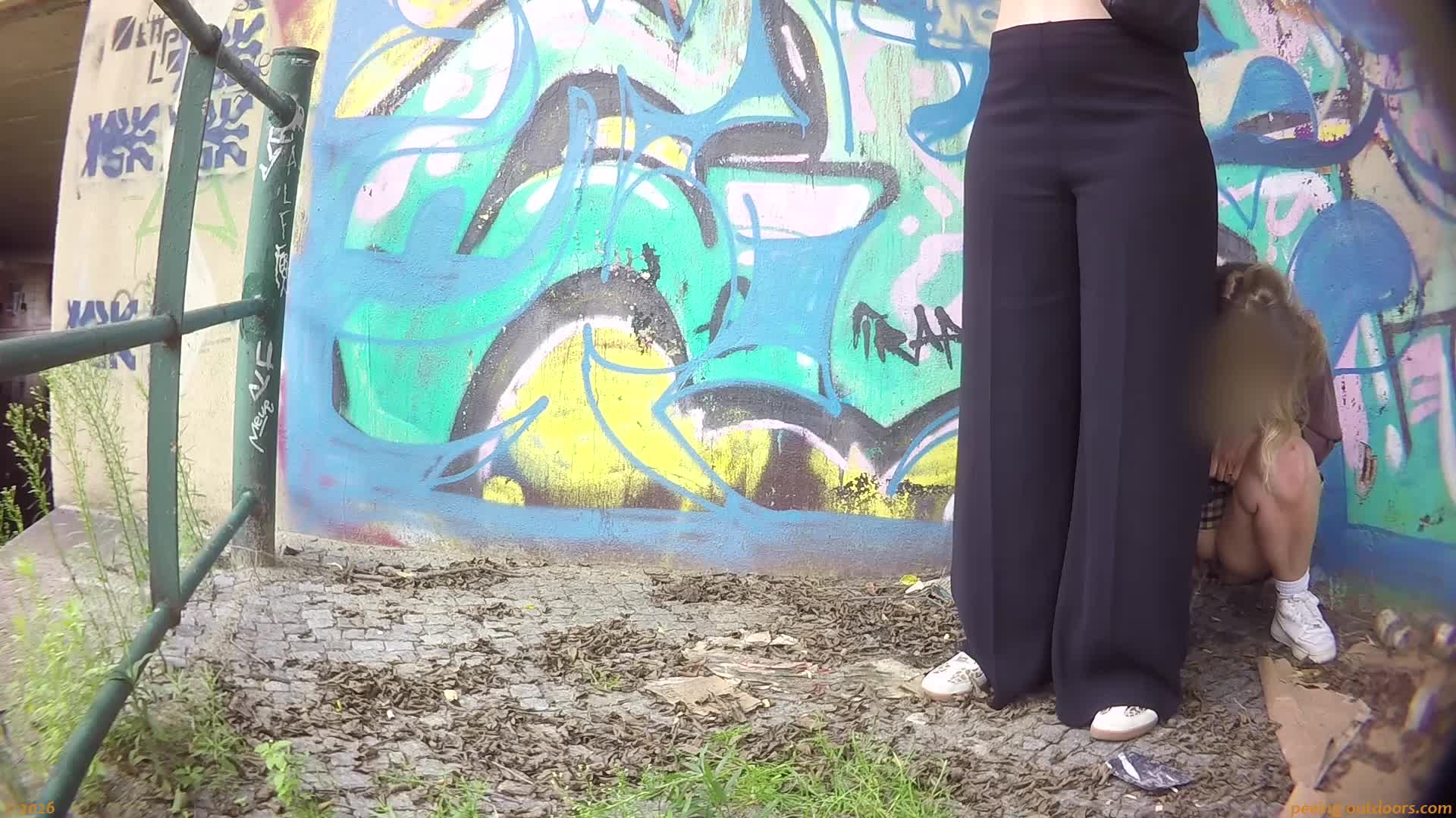 - Sweet blonde squats in a corner to empty her bladder with a friend standing guard.
