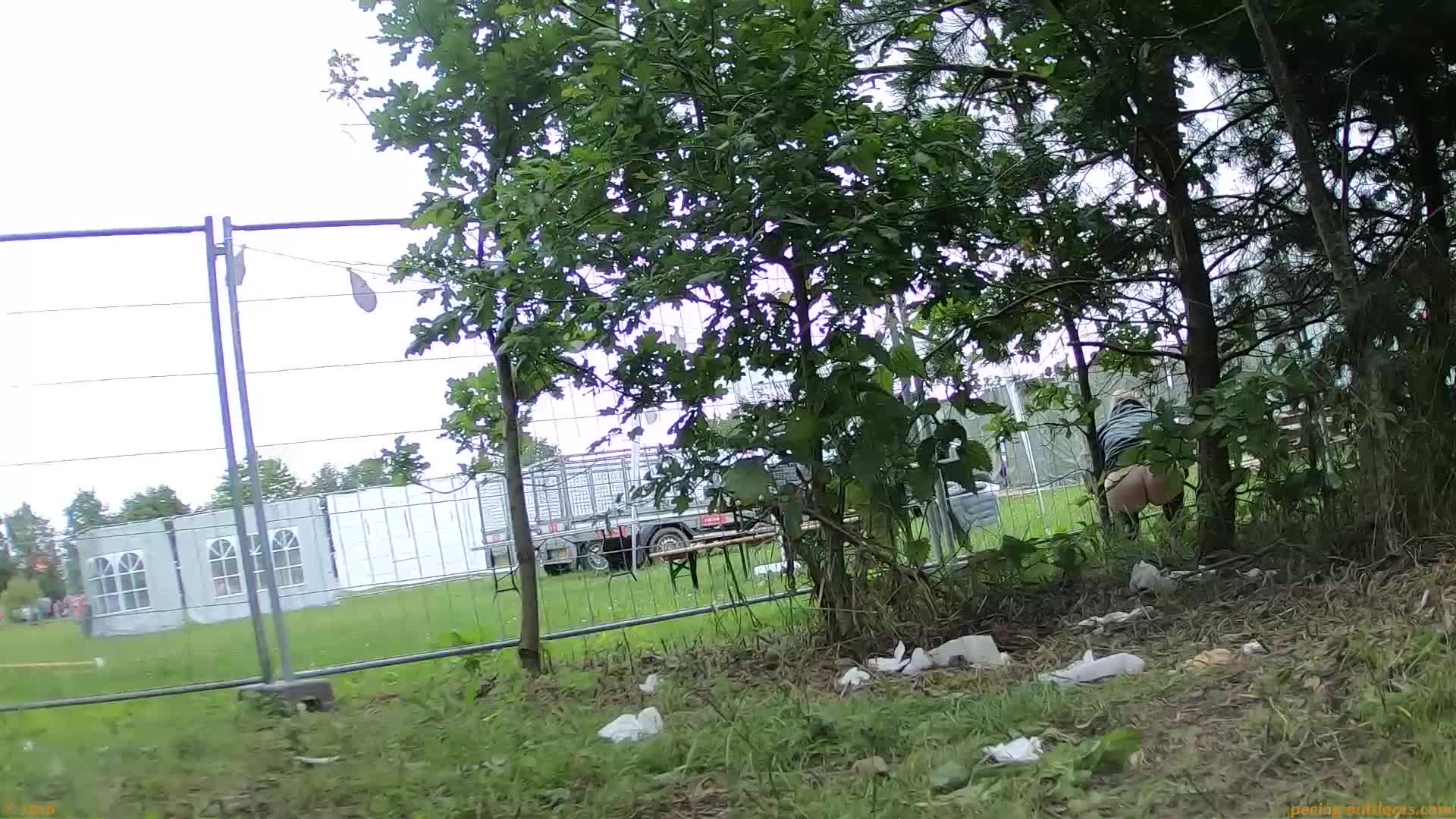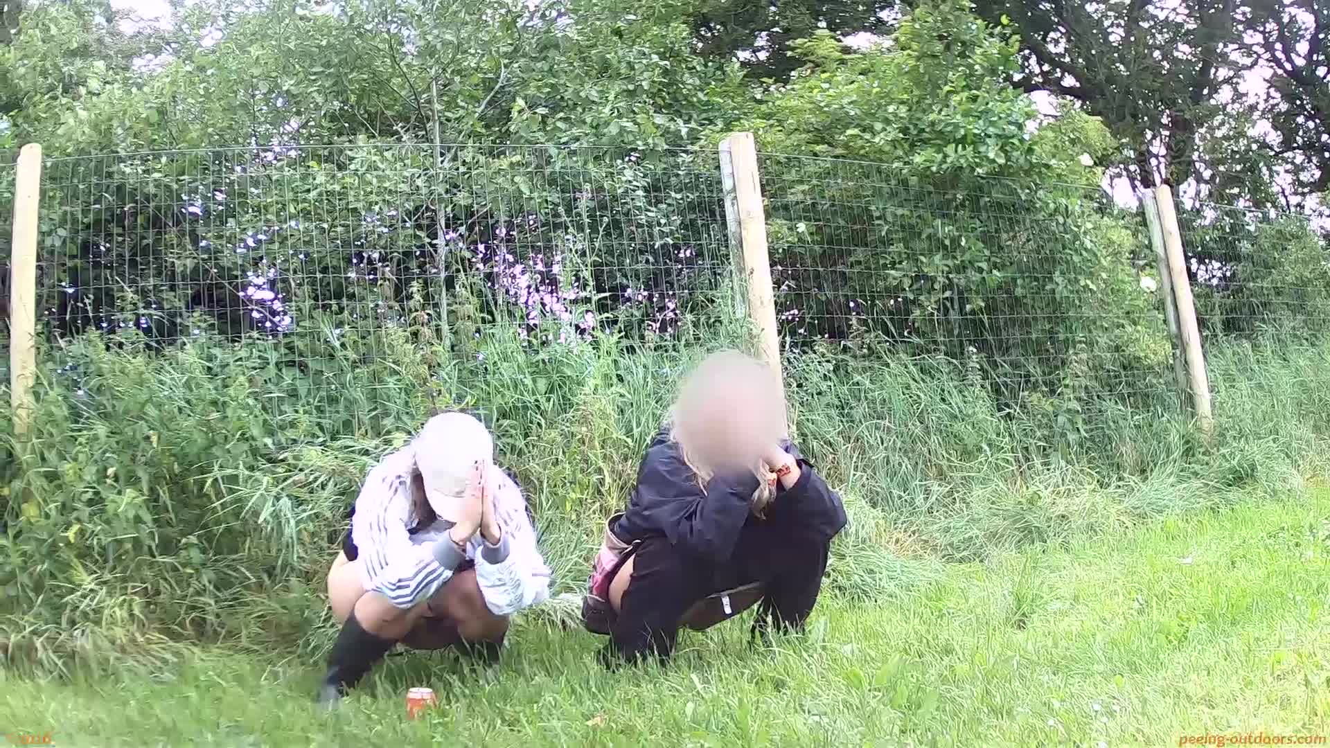 - Two girls are caught with bare bums next to a fence.