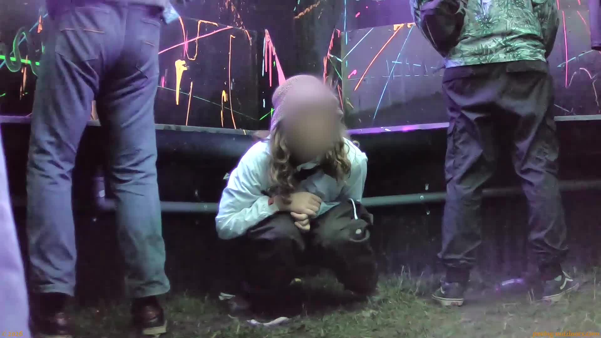 - Two girls crouch down between and next to a couple of guys standing at the urinals.