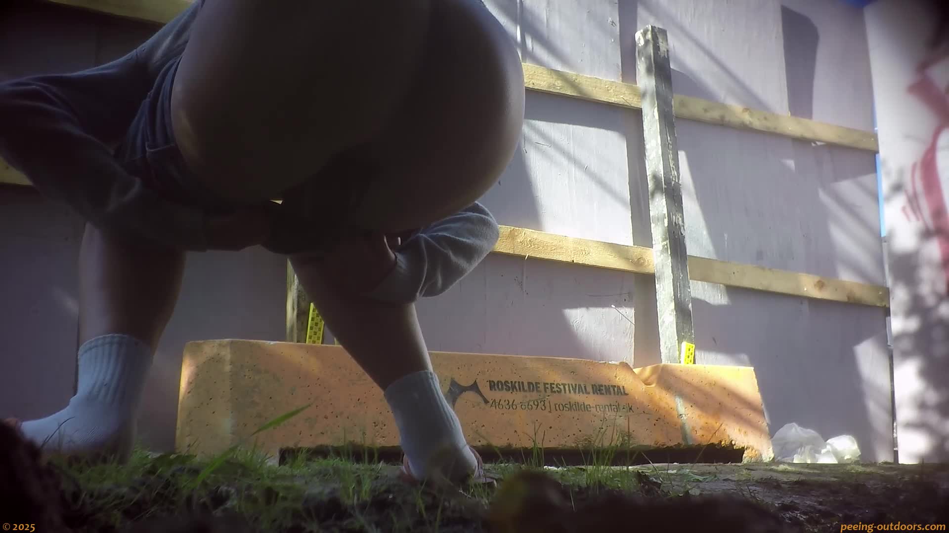- Chubby girl pees a visible stream in front of a wooden wall.