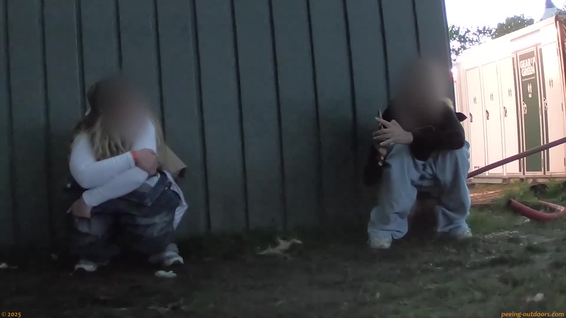 - Chubby girl is caught in a half squat, pissing behind a tree.