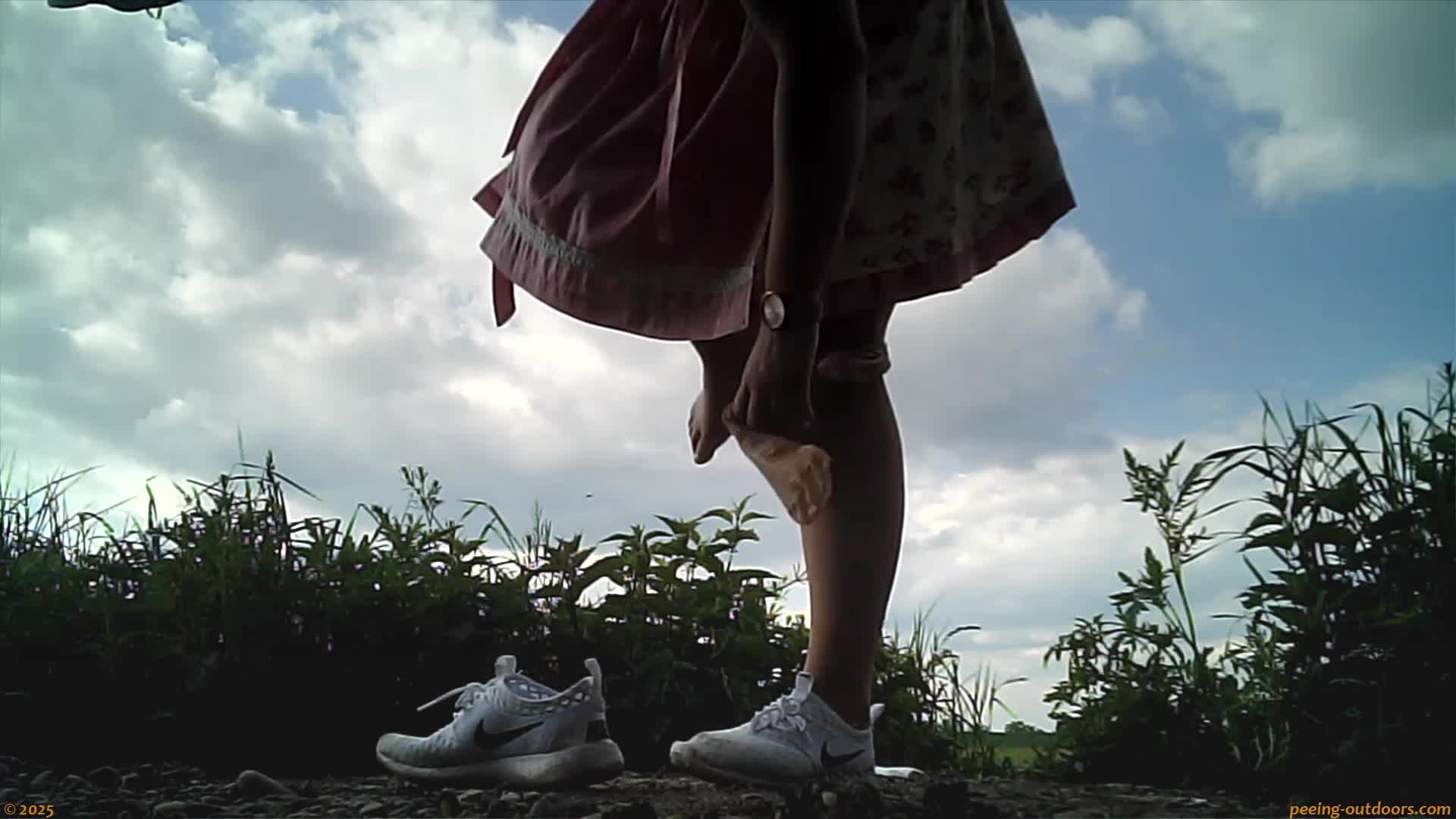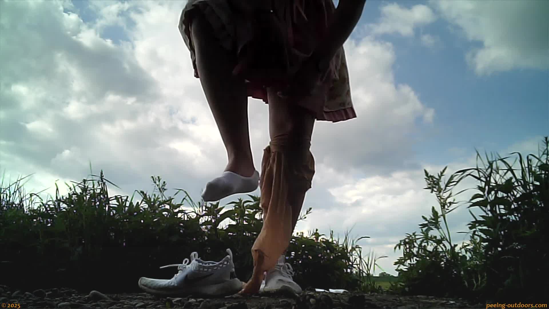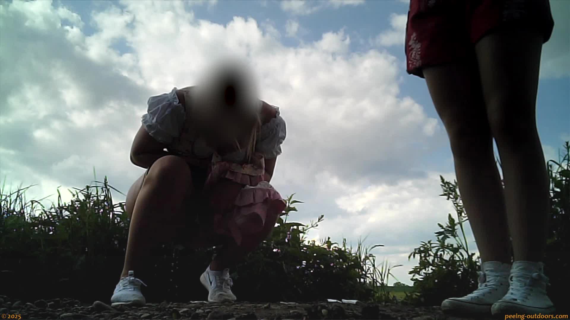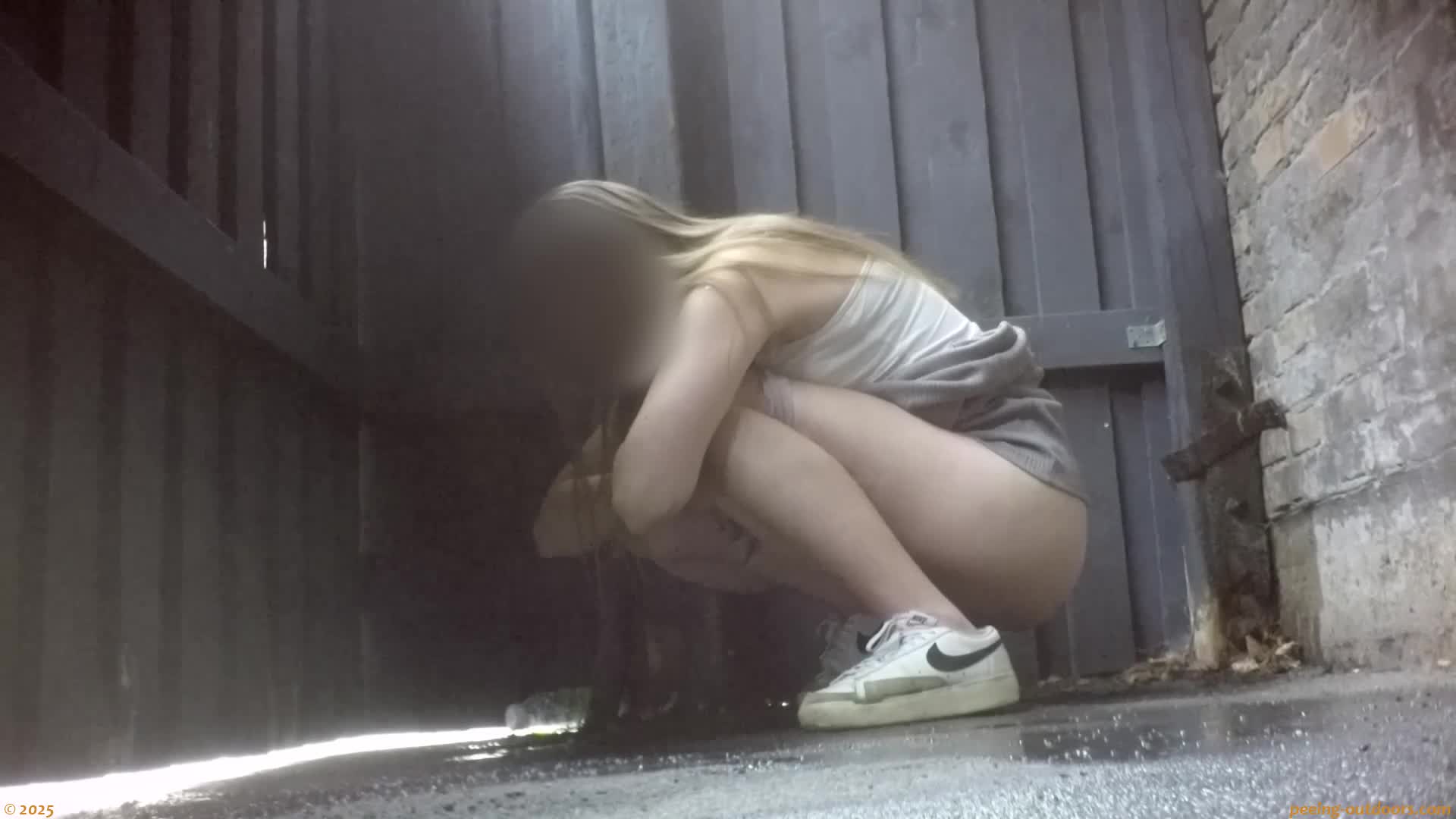 - Sweet blonde crouches in frontal view and pees a visible stream.