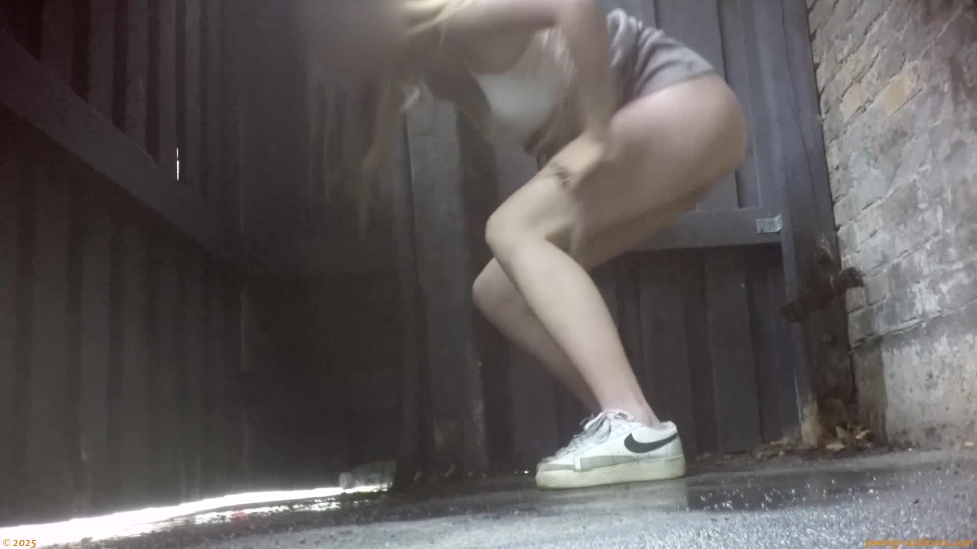 - Pretty girl finds shelter in a small shed and forms a huge puddle on the concrete.