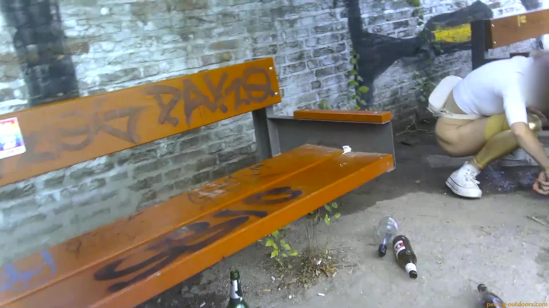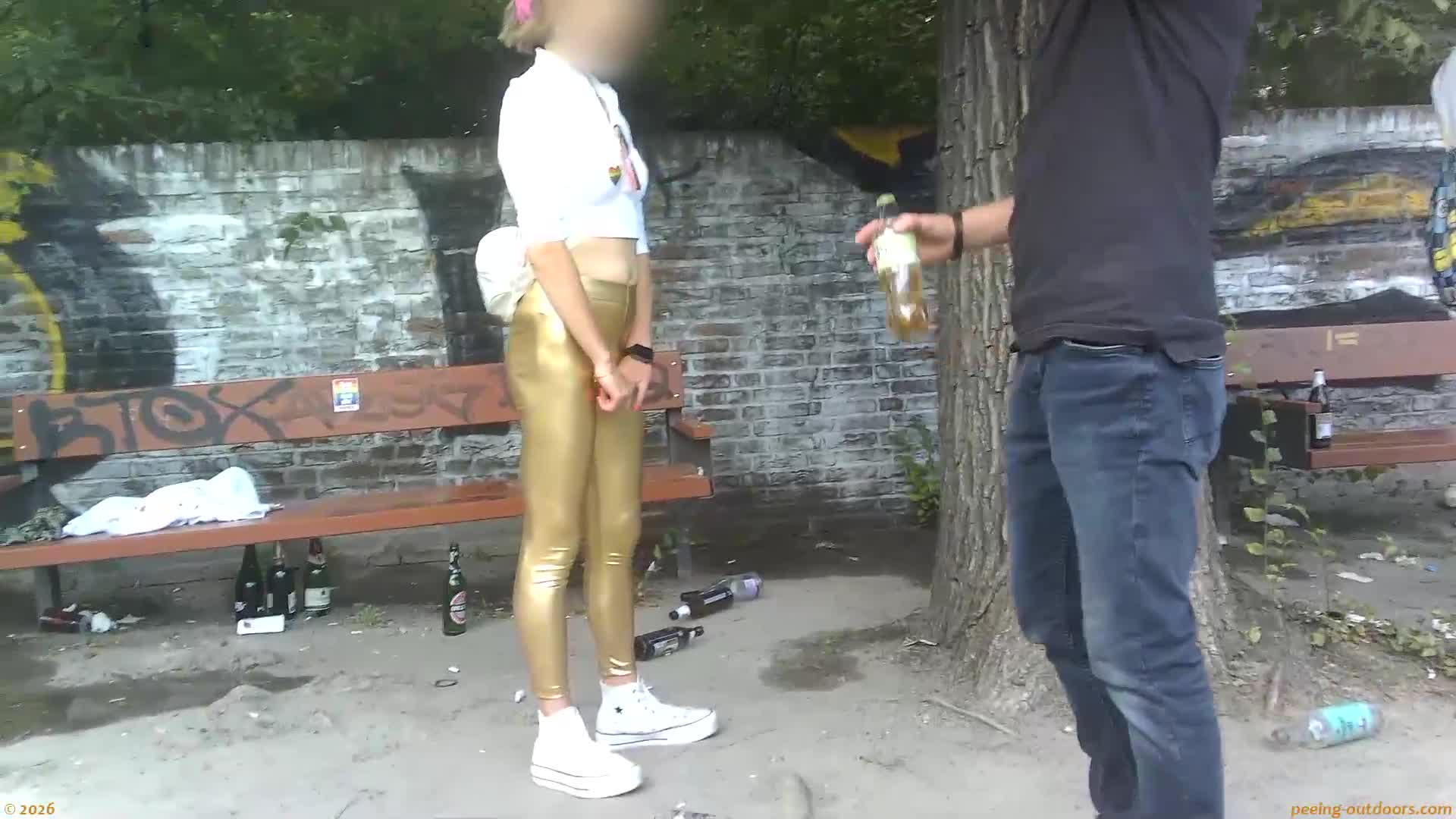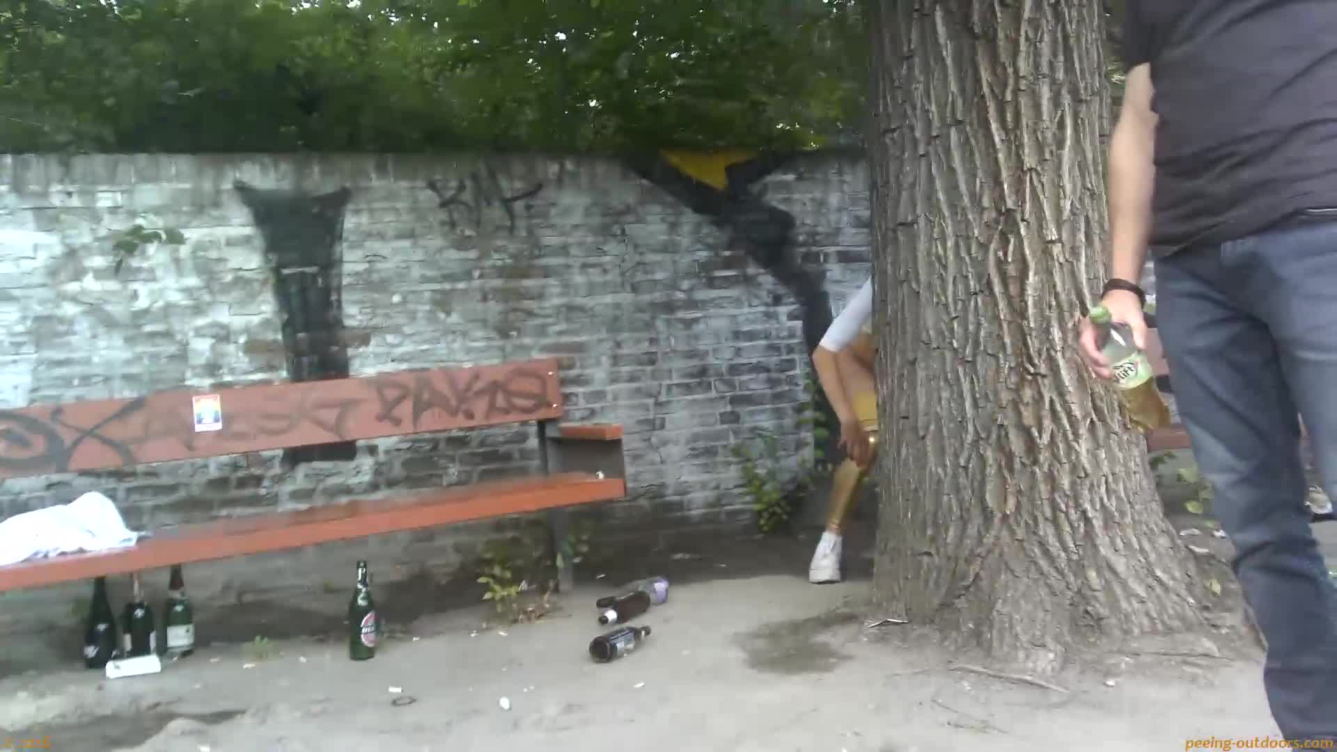 - Sweet chick tries to hide behind a tree and leaves a huge puddle on the sandy ground.