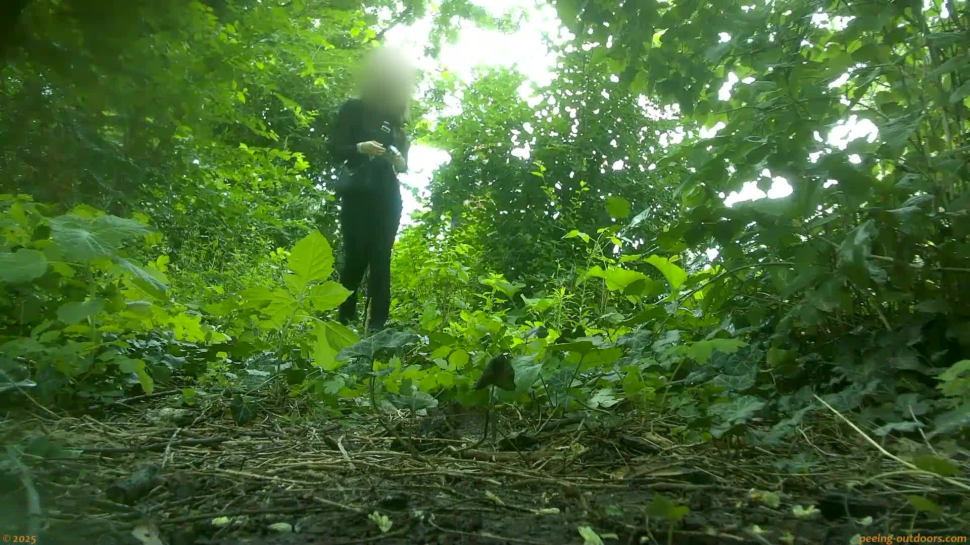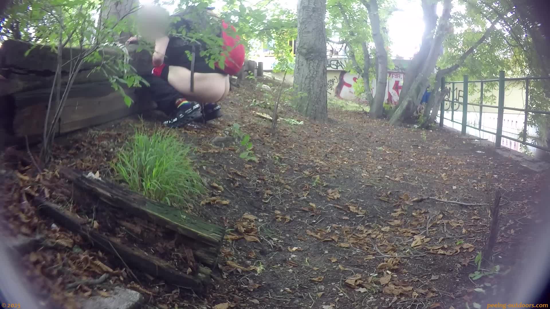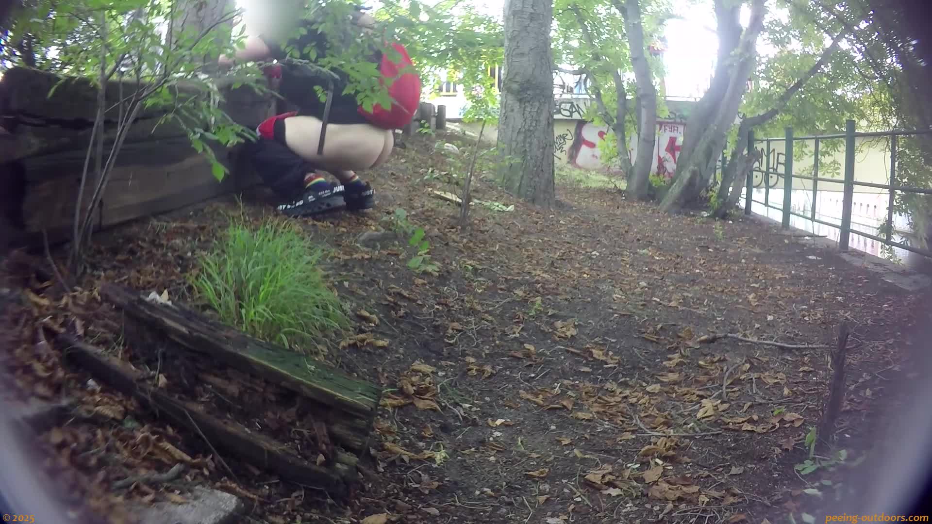 - Young woman doesn’t know where she can pee undisturbed, but finally she can’t stand it any longer and simply crouches behind a small wooden ledge, where we can see her clearly from the side.