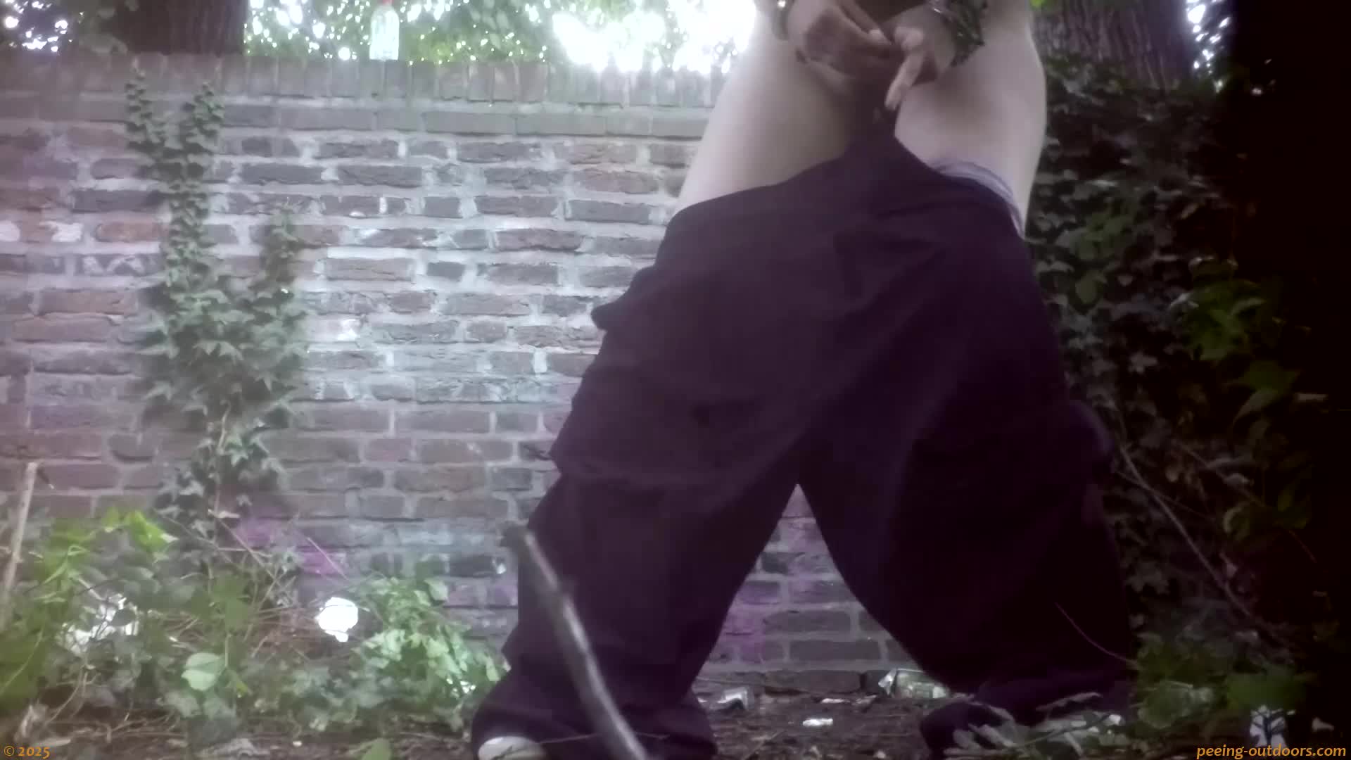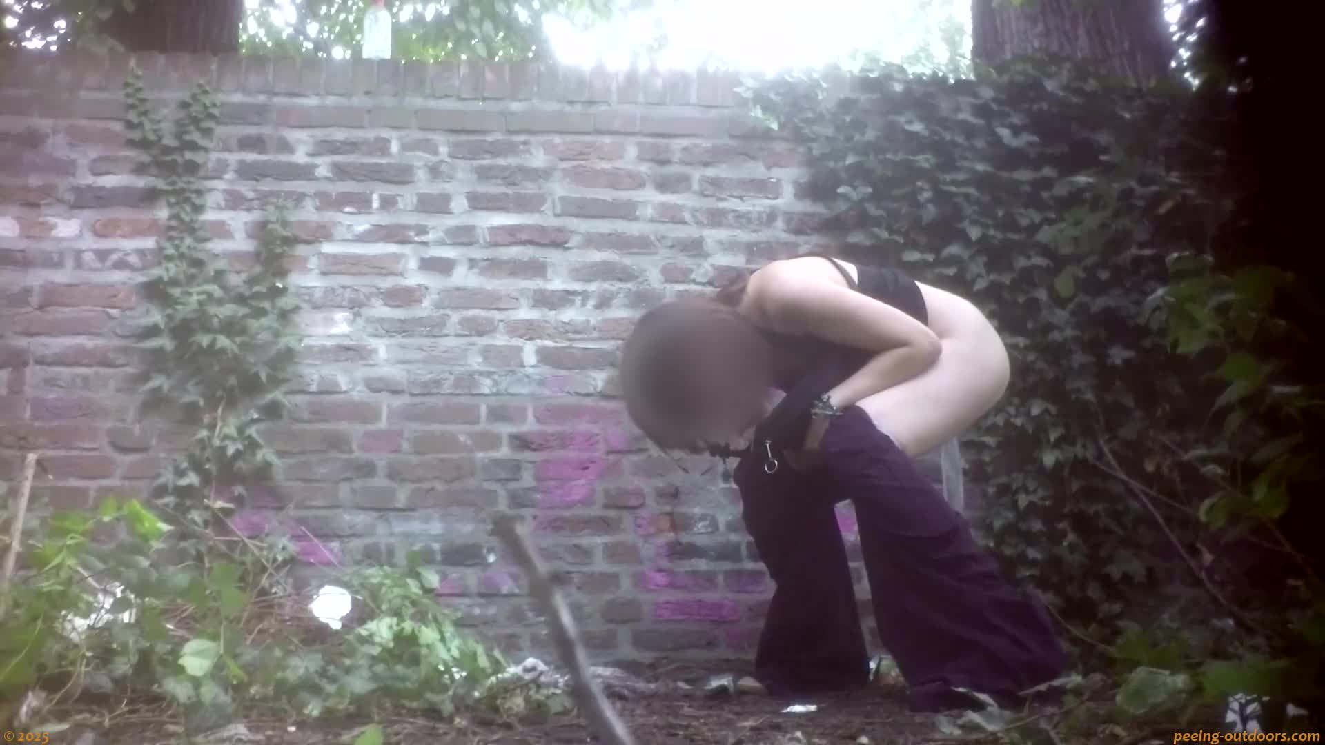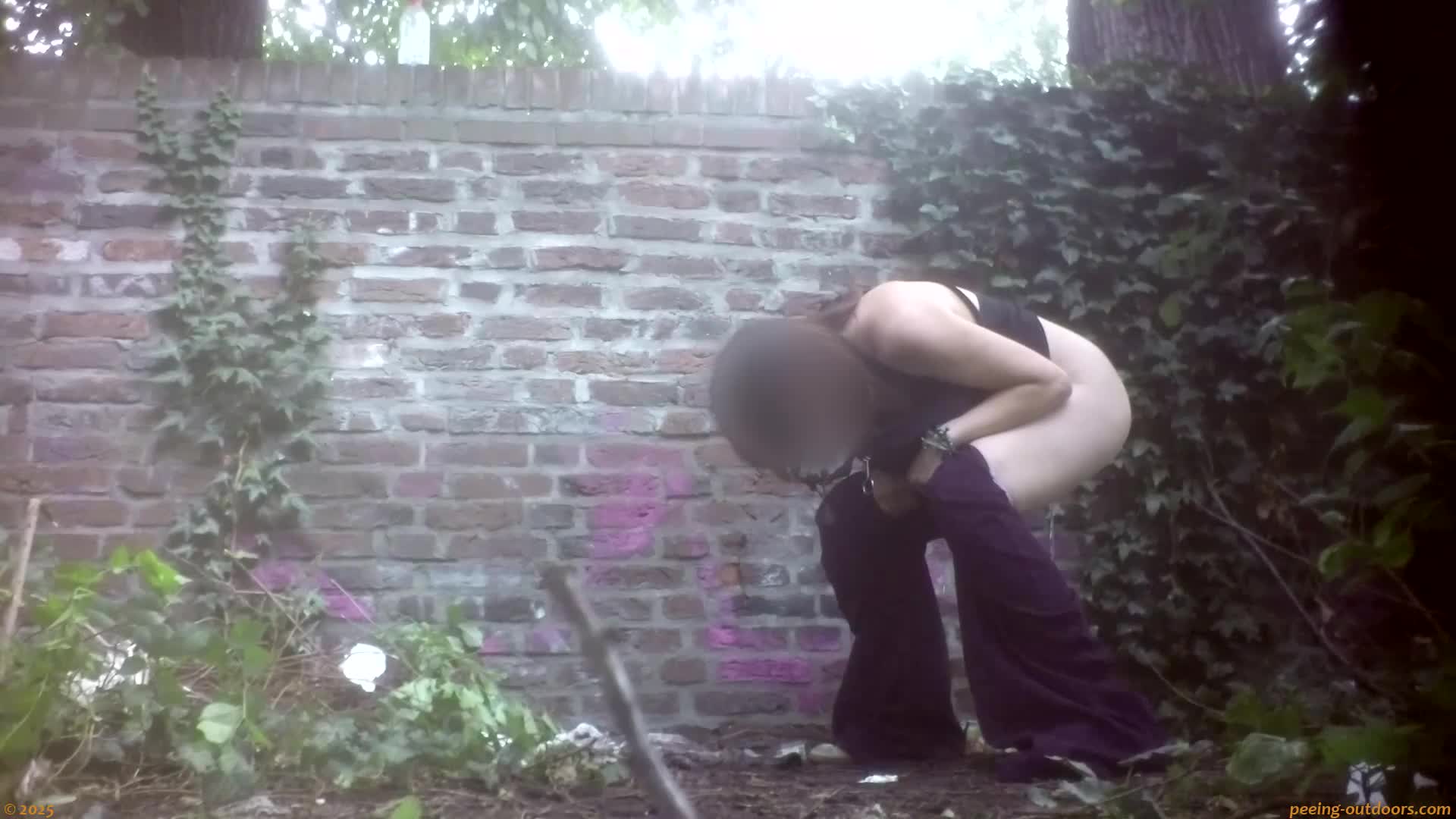 - Hot chick relieves herself high squatting behind a wall.