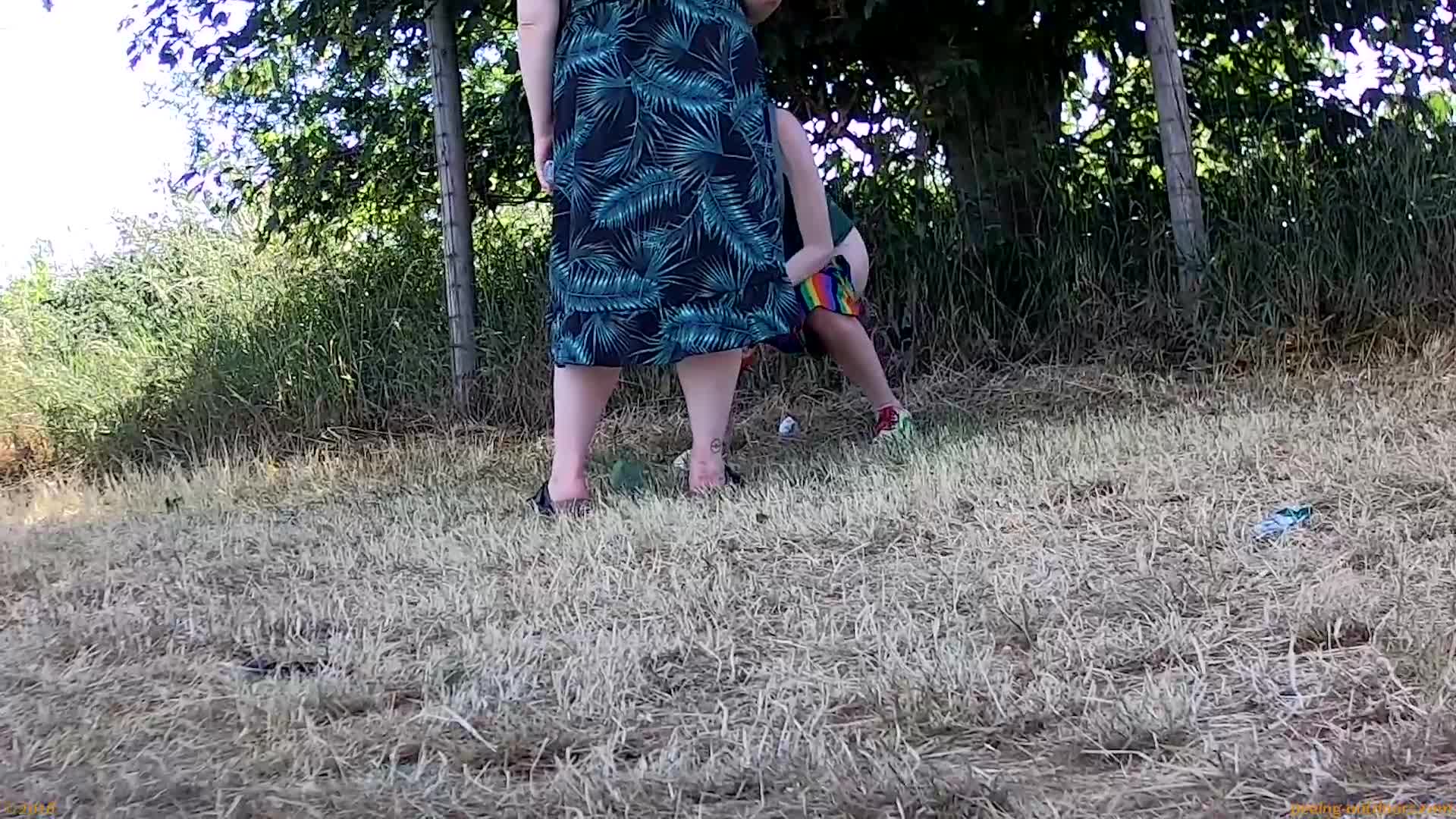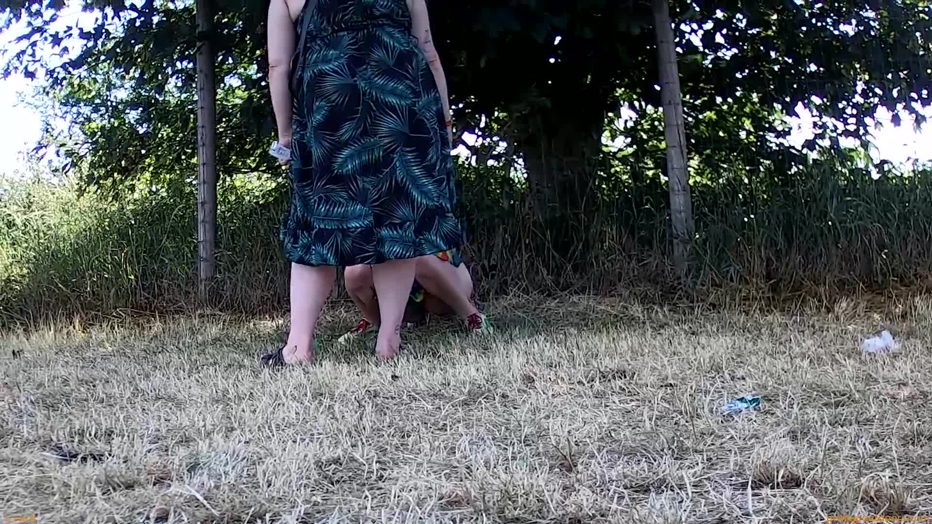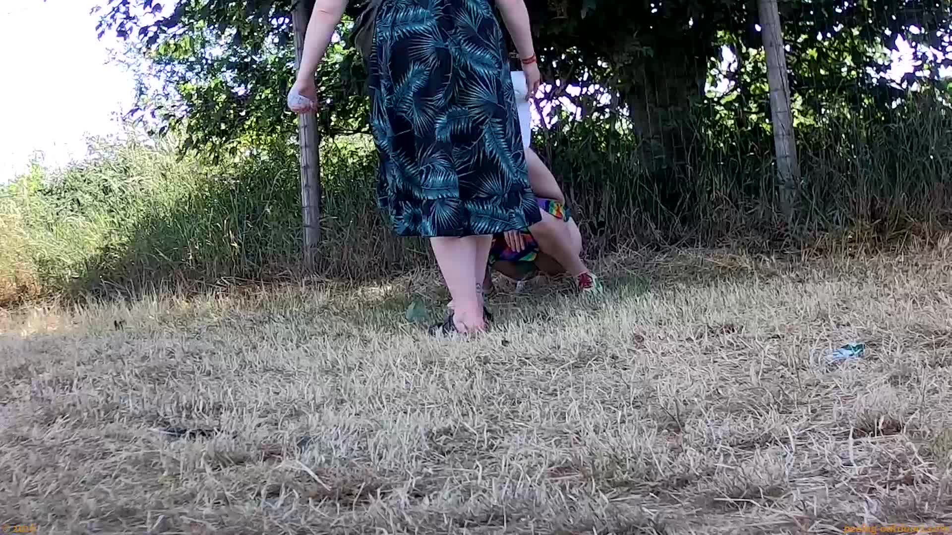 • Two ladies are pissing on the grass in front of a fence.
