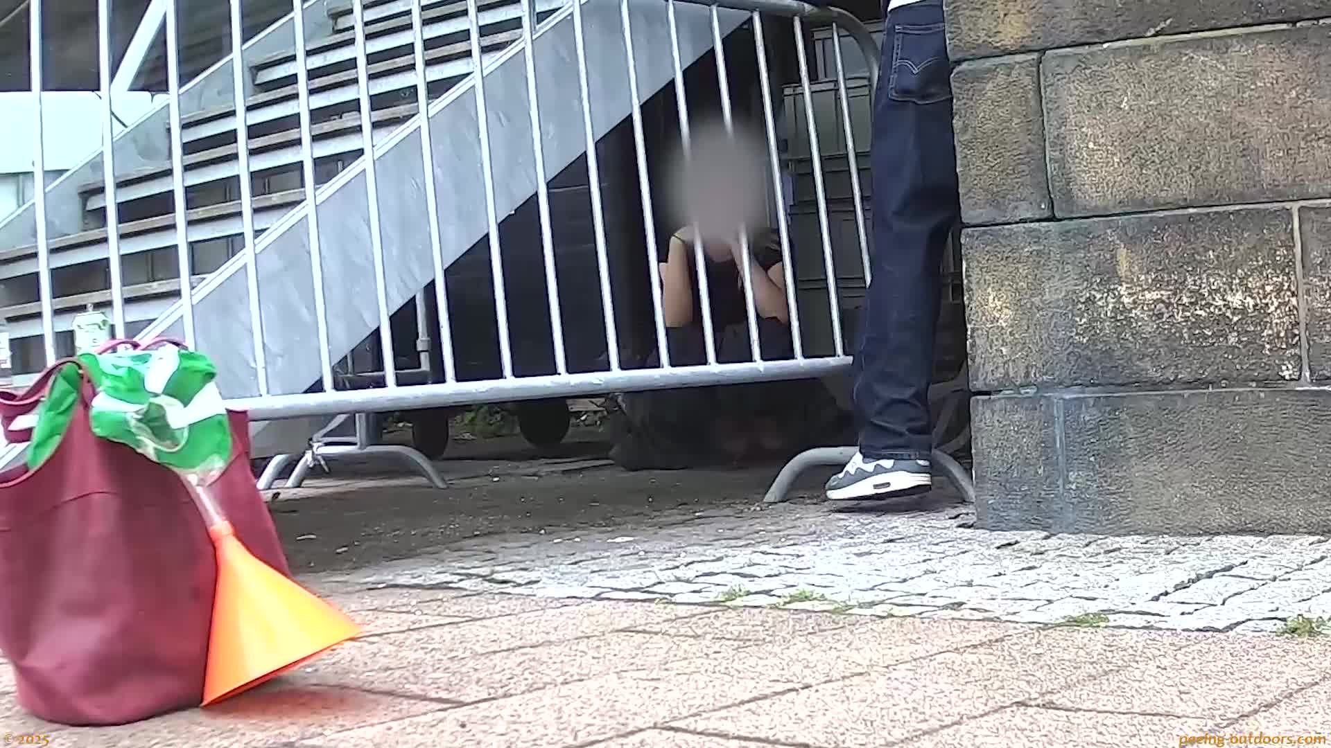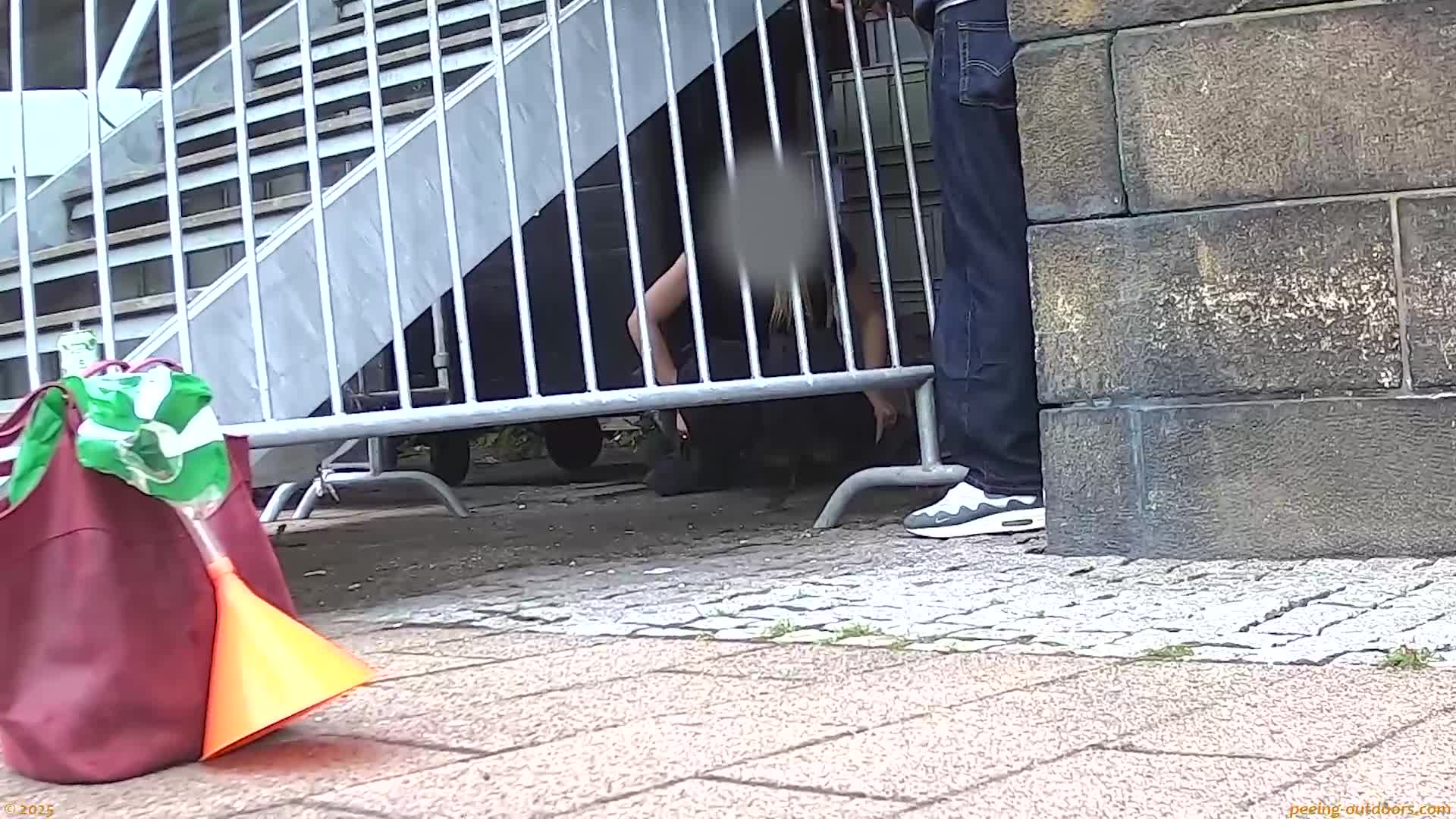 - Young lady is hiding under a metal staircase for a quick pee break.