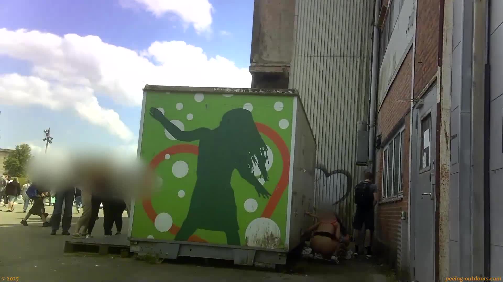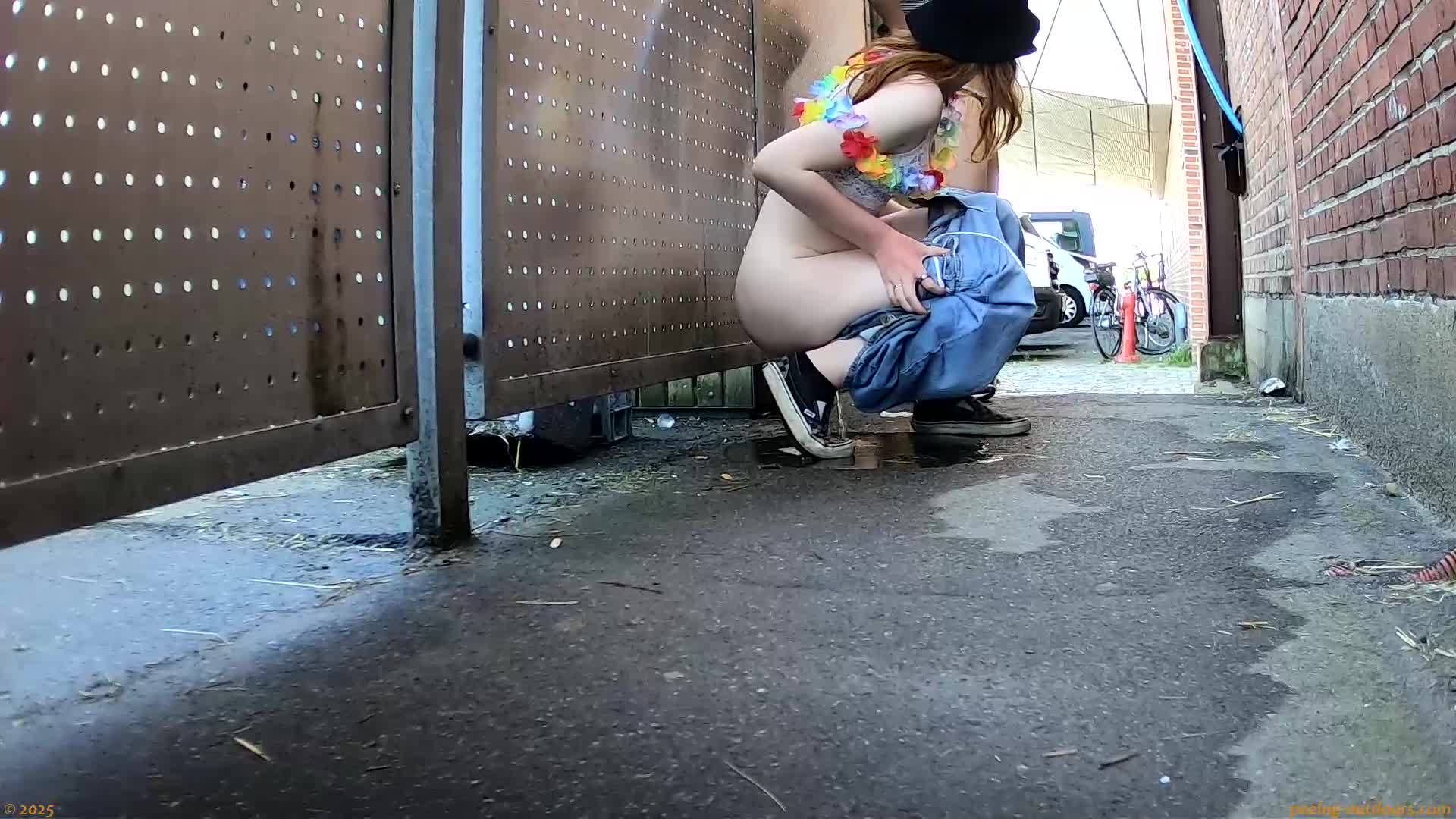 - Sweet redhead crouches in a narrow passageway and pees a river on the concrete.
