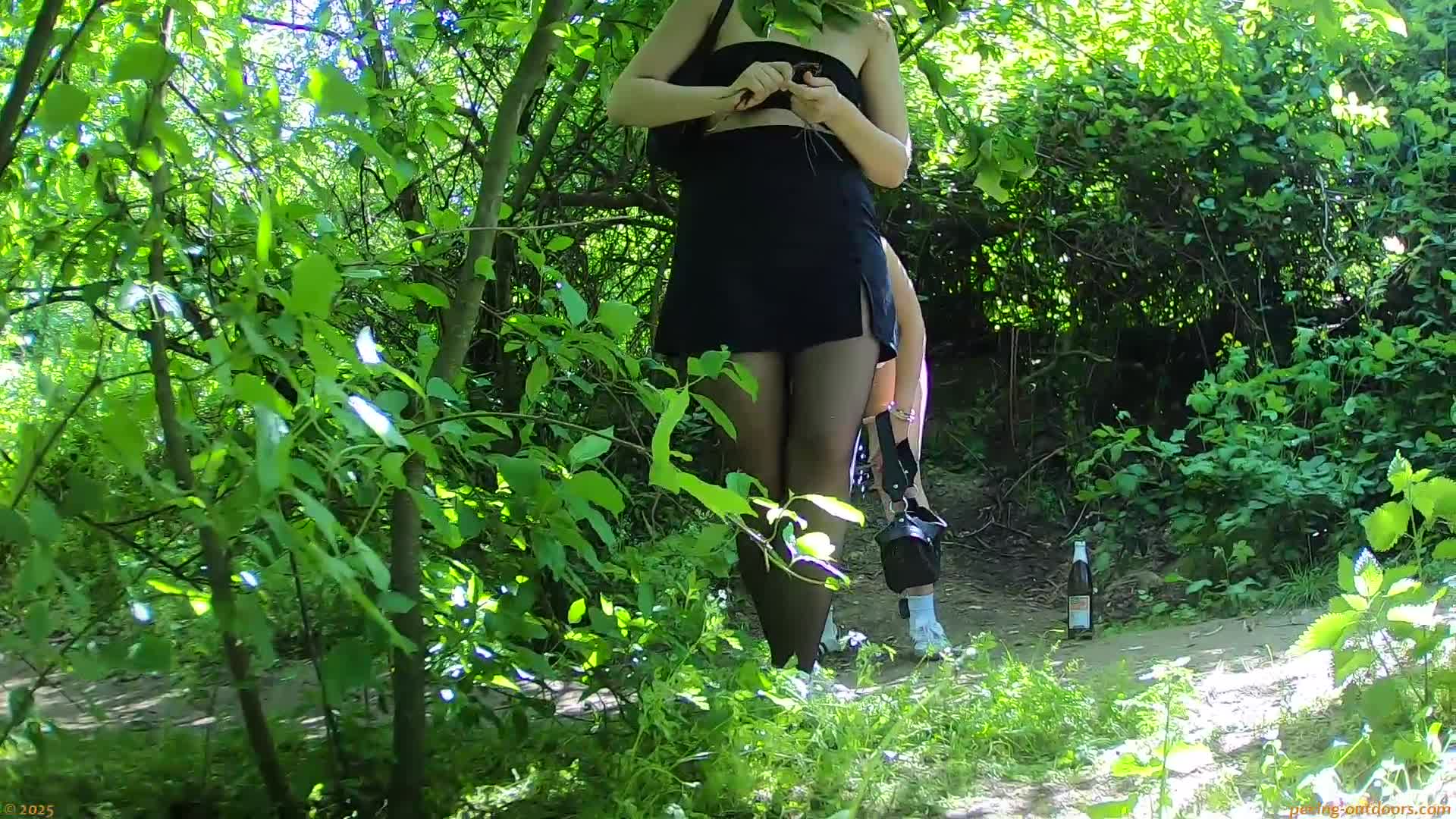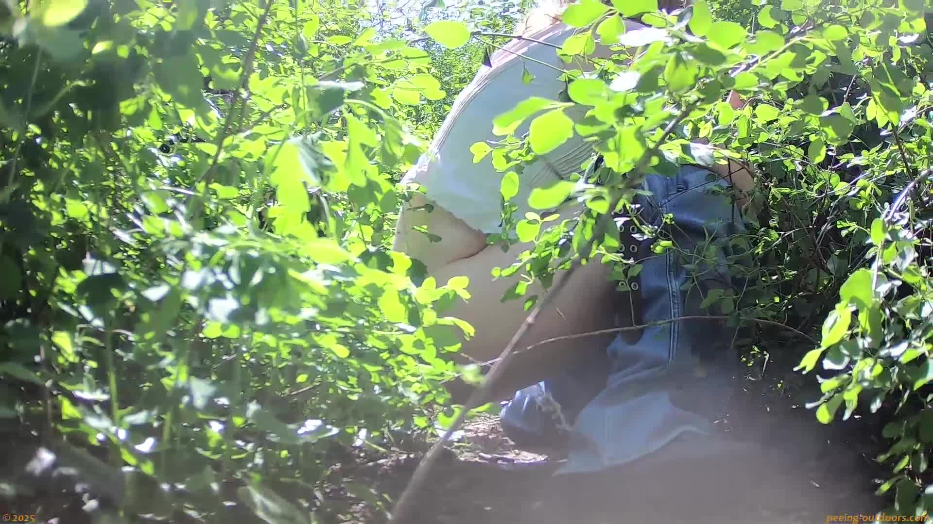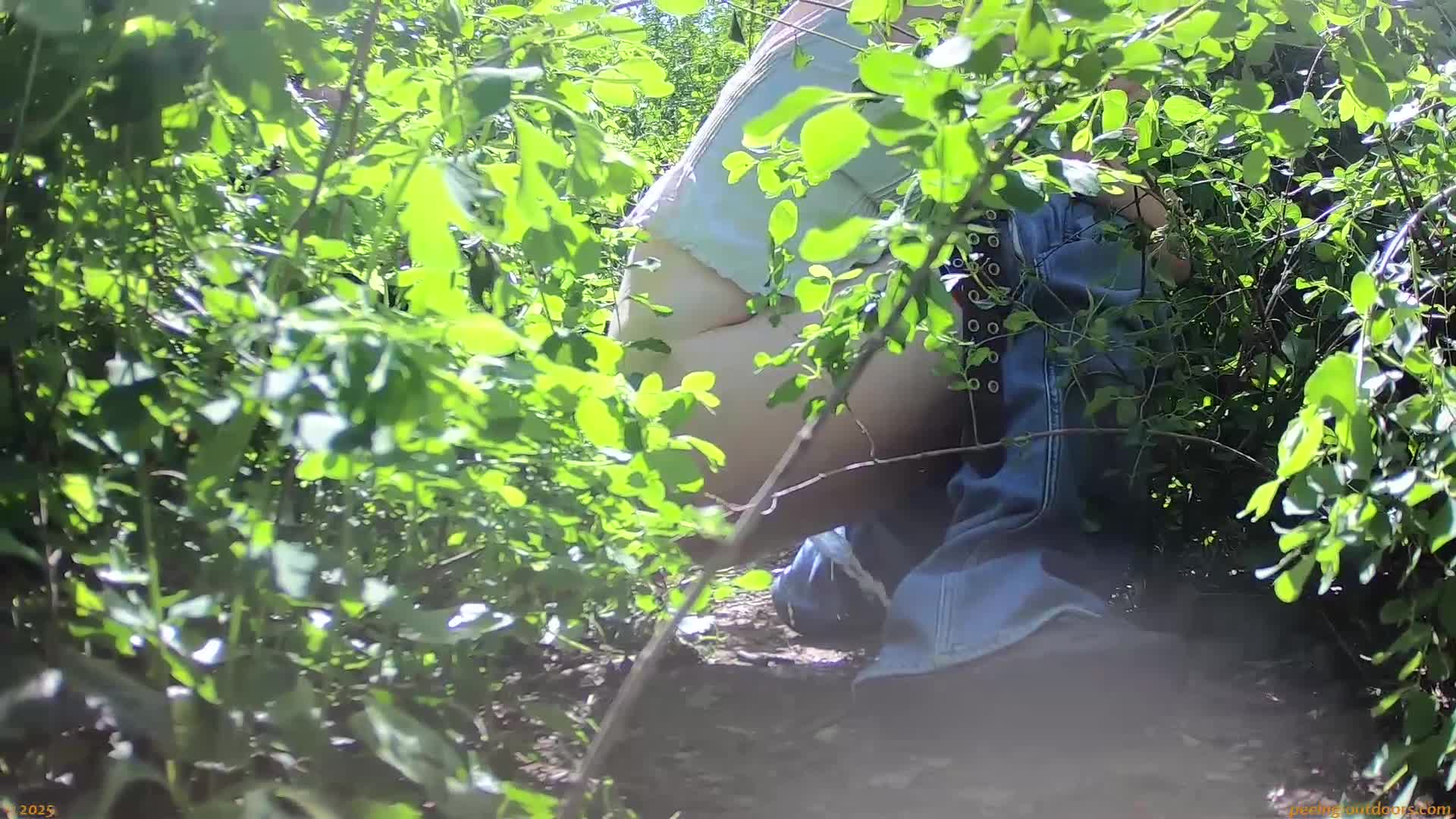 - Pretty girl squats next to a metal fence to empty her bladder.