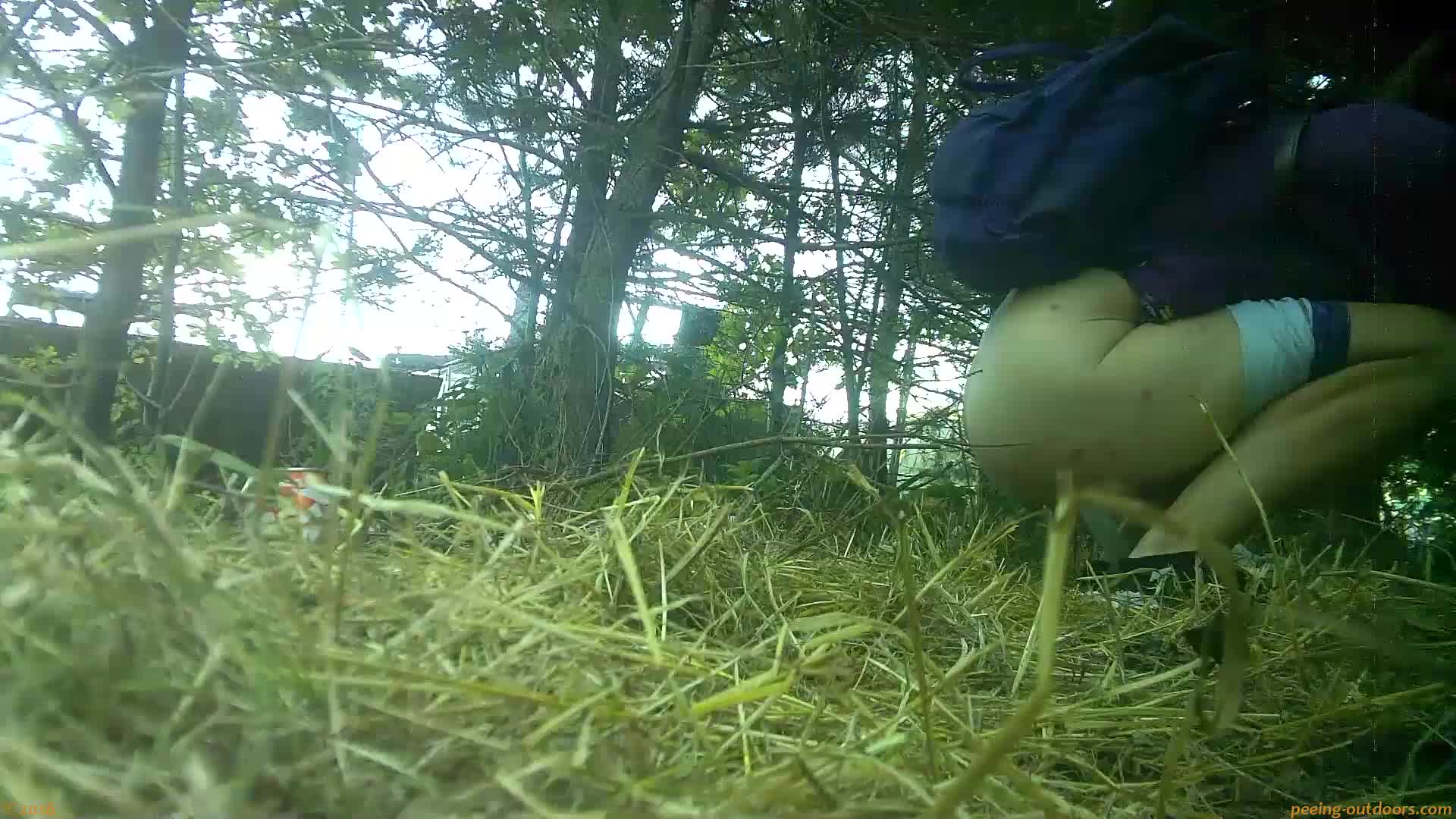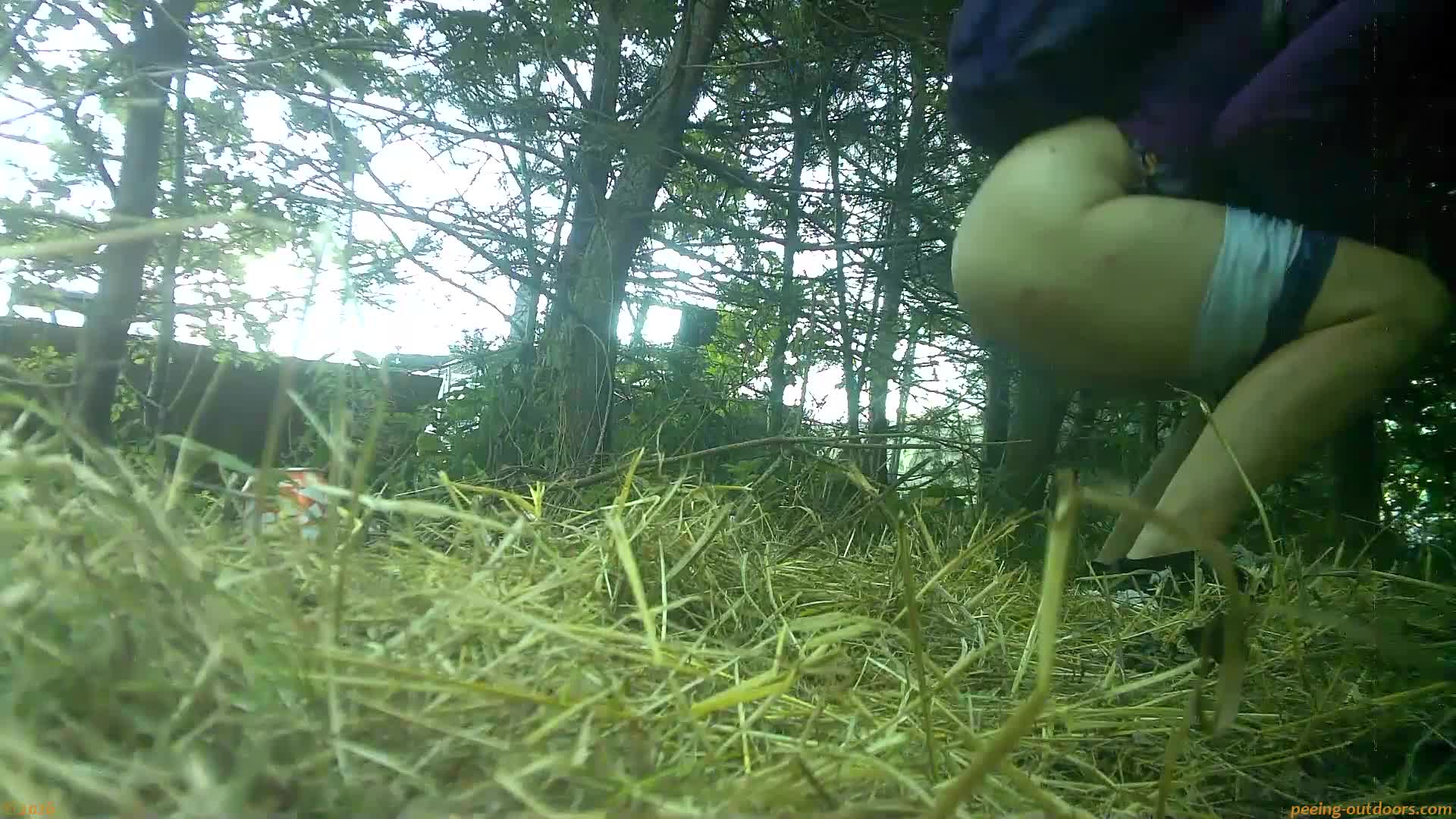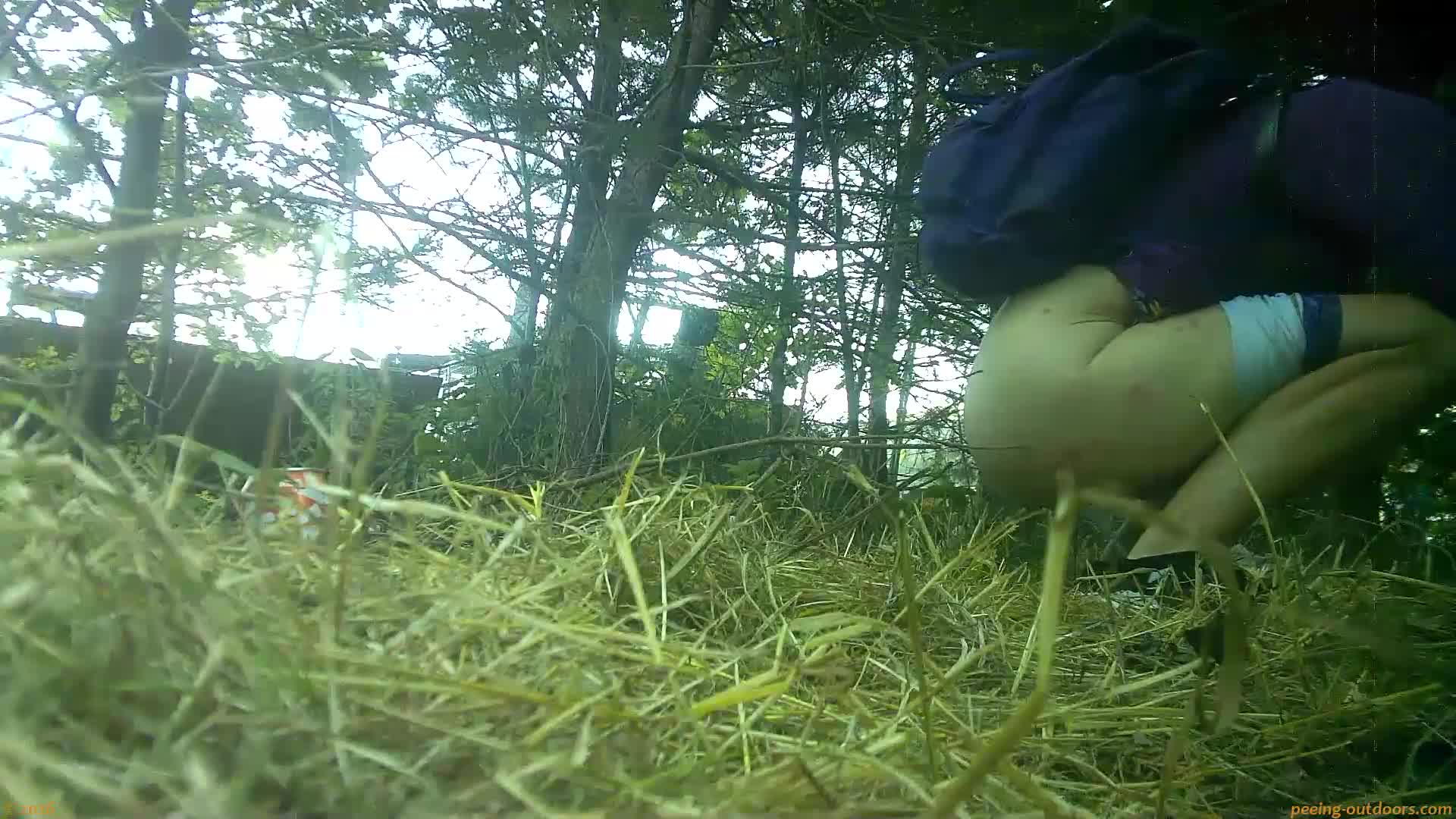 - Sweet blonde is caught pissing a strong jet in a nice half squat.