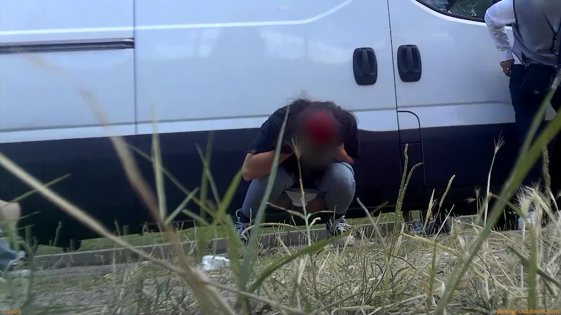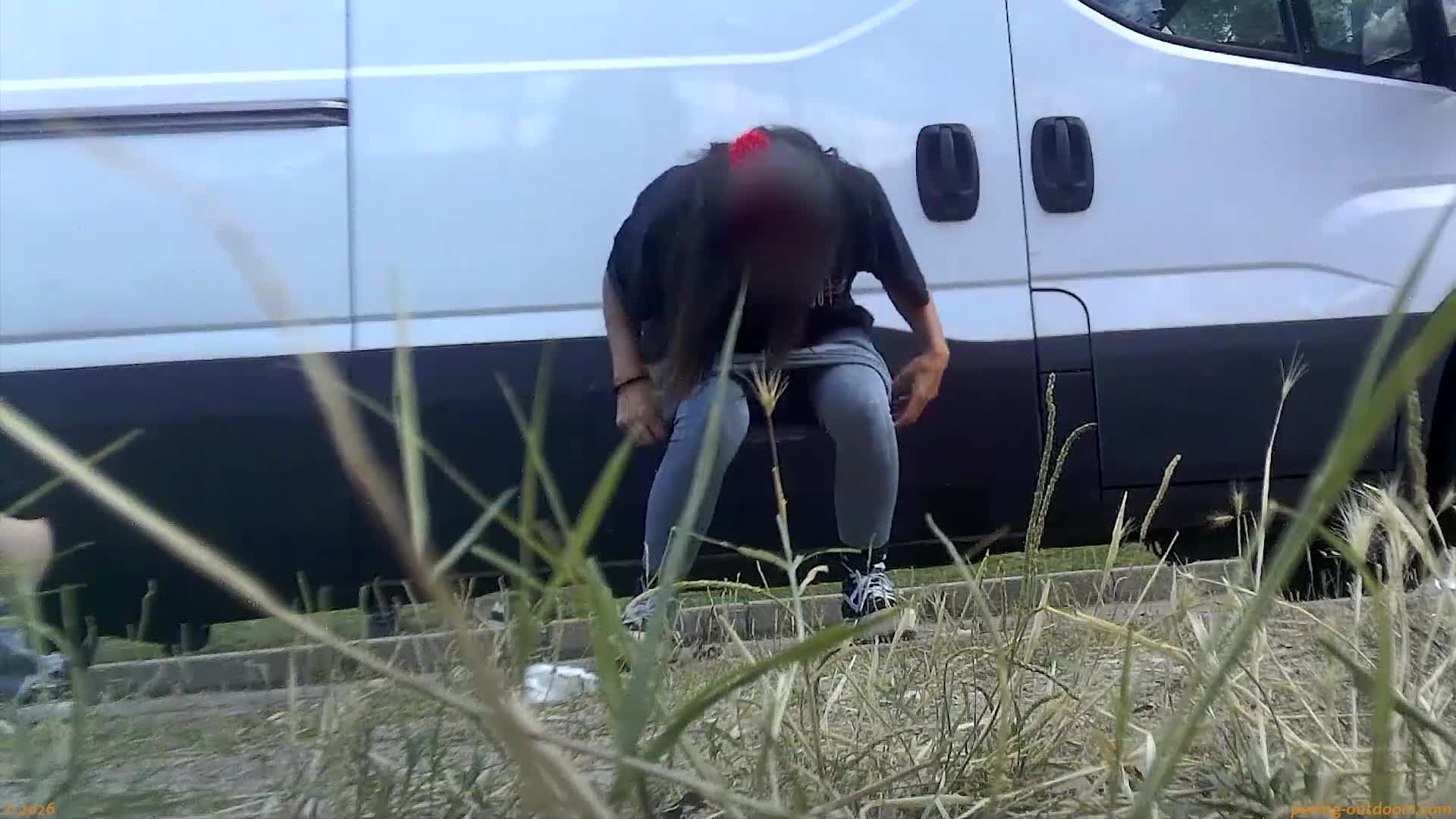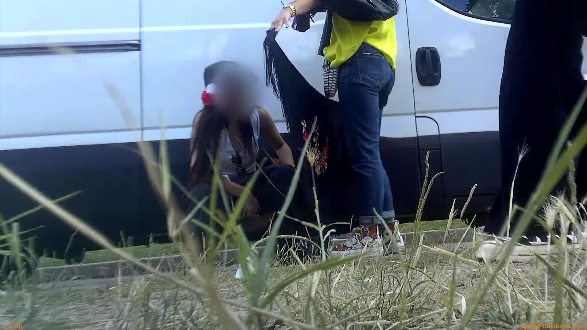 - Chubby girl releases a strong jet next to a parked car.