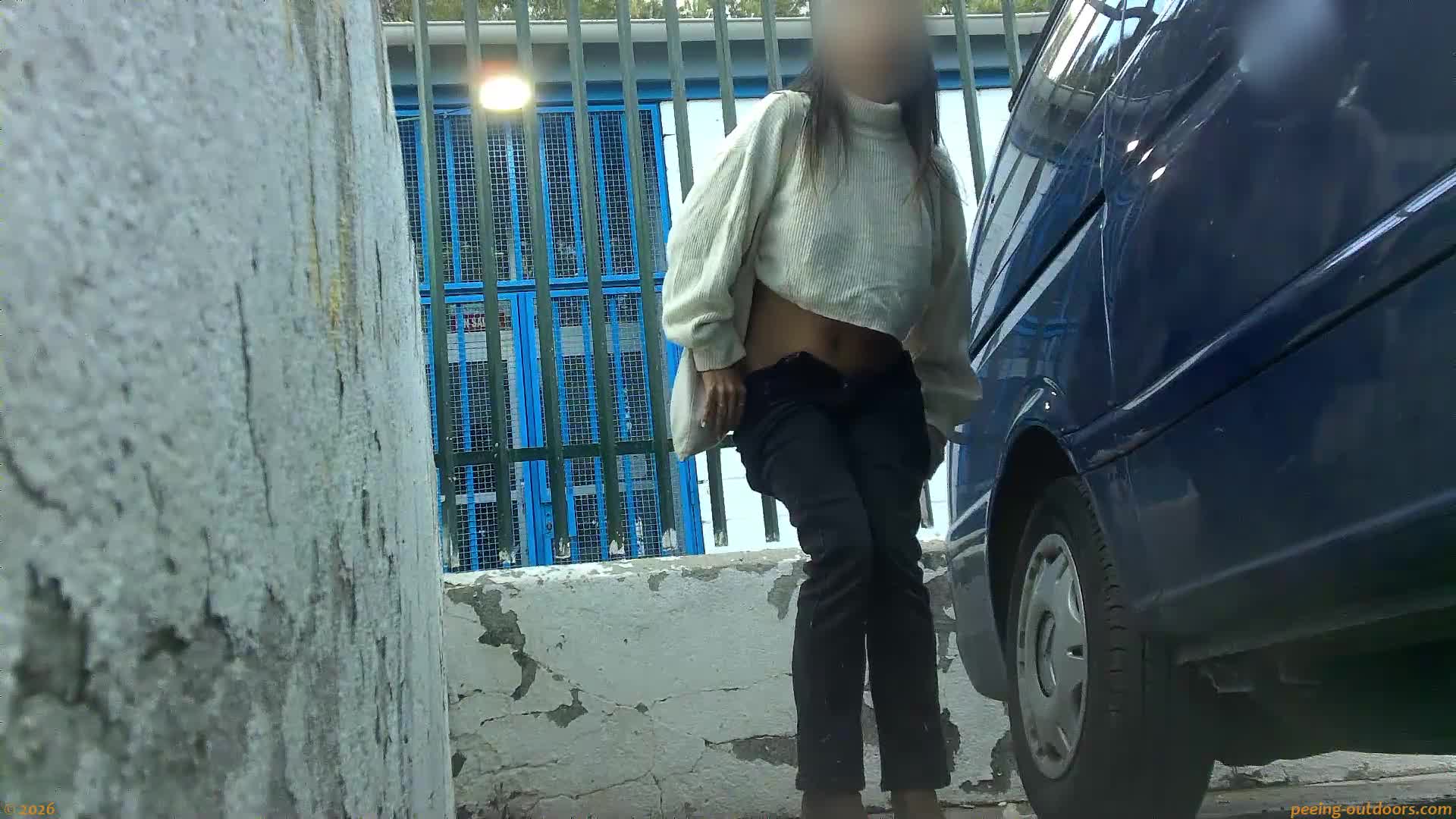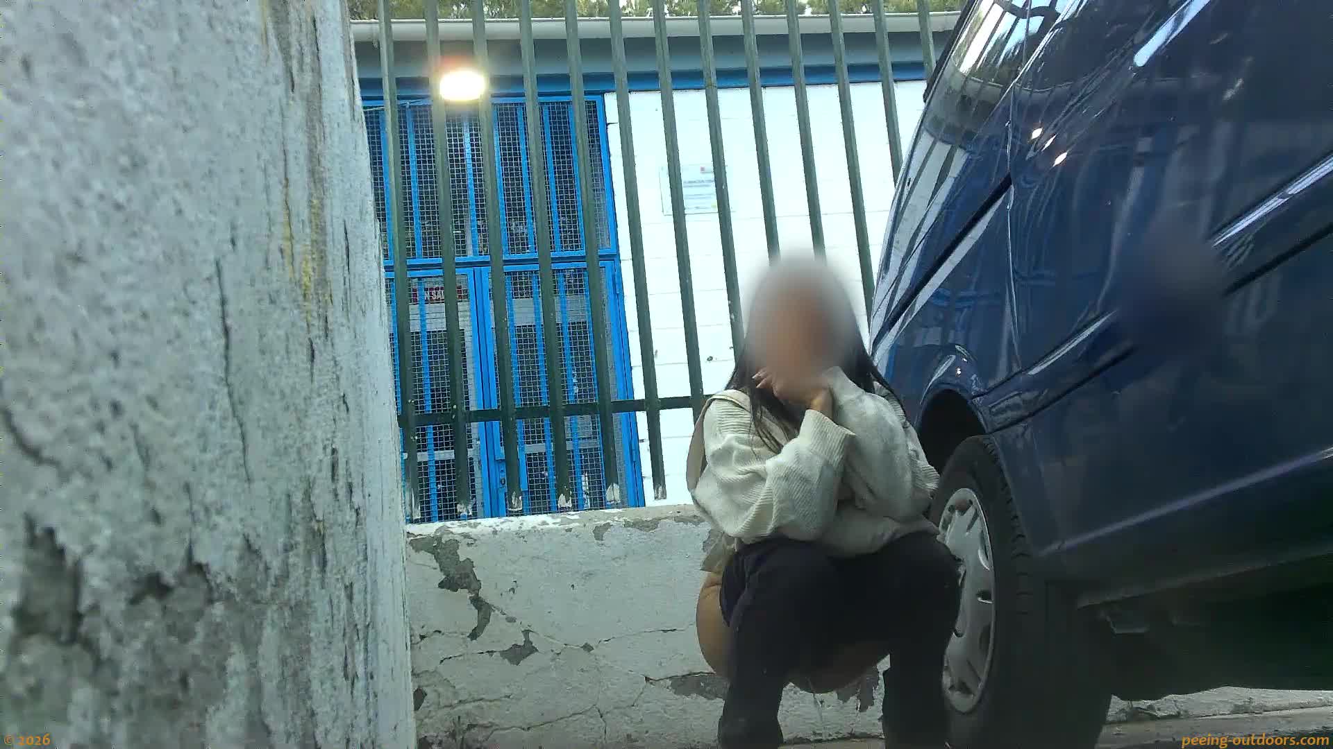 - Lovely girl tries to hide behind a parked car.